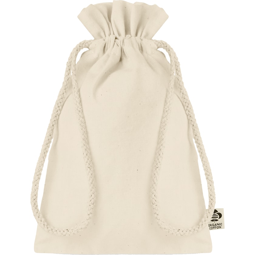 Lille bomuldspose i økologisk bomuld. Perfekt for dig som skal give en mindre gave væk! På den ene side er der en etiket som viser at posen er fremstillet af økologisk bomuld.