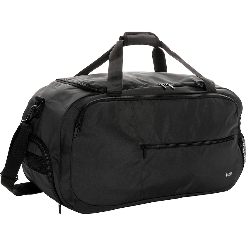 Miljøvenlig sportstaske i genbrugsmateriale. Sportstasken har udover hovedrummet også en opbevaringslomme foran med lynlås. Udvendigt er der også en netlomme. Tasken er fremstillet af rPET, dvs. genbrugs PET-flasker.