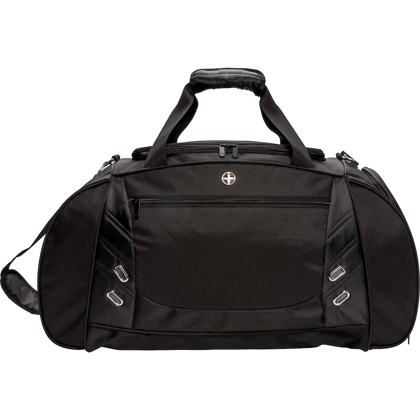Højkvalitets sportstaske fra Swiss Peak Tasken har et rumligt hovedrum med en u-formet lynlås, ventilerede skorum på siden og flaskeholdere. På forsiden er en opbevaringslomme med lynlås til f.eks. smartphones eller andre små ejendele. Skulderremmen er justerbar. Tasken er helt fri for PVC og er derfor miljøvenlig.