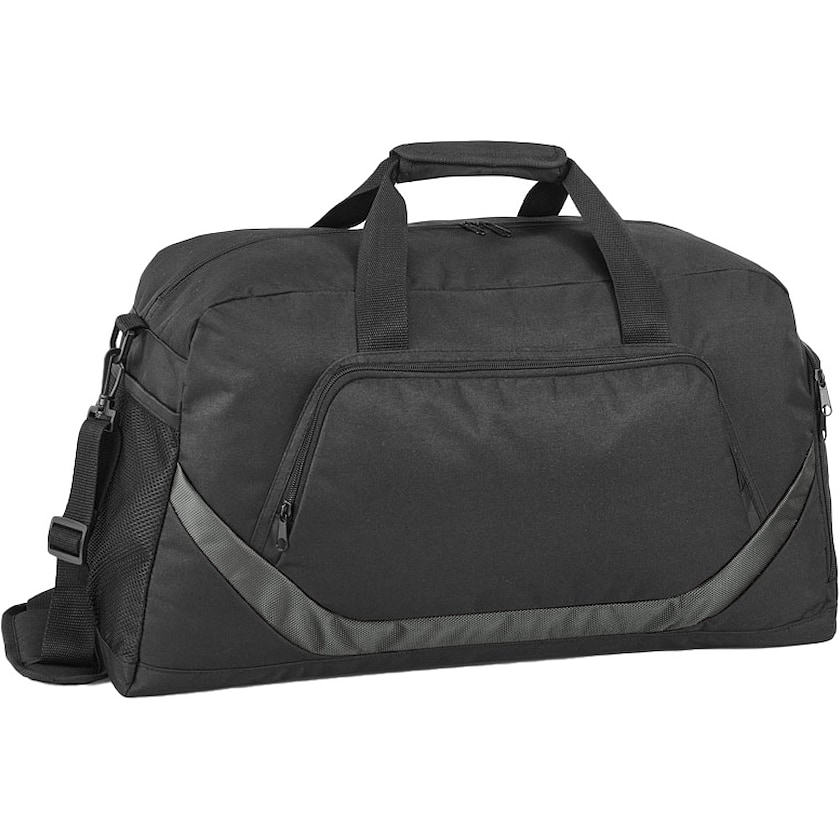 Rummelig sportstaske med logo. West Hills har foret inderside og fast bund. Foran har tasken en lomme med lynlås. På siderne er der en netlomme og en lomme med lynlås. Stropperne er foret og justerbare.